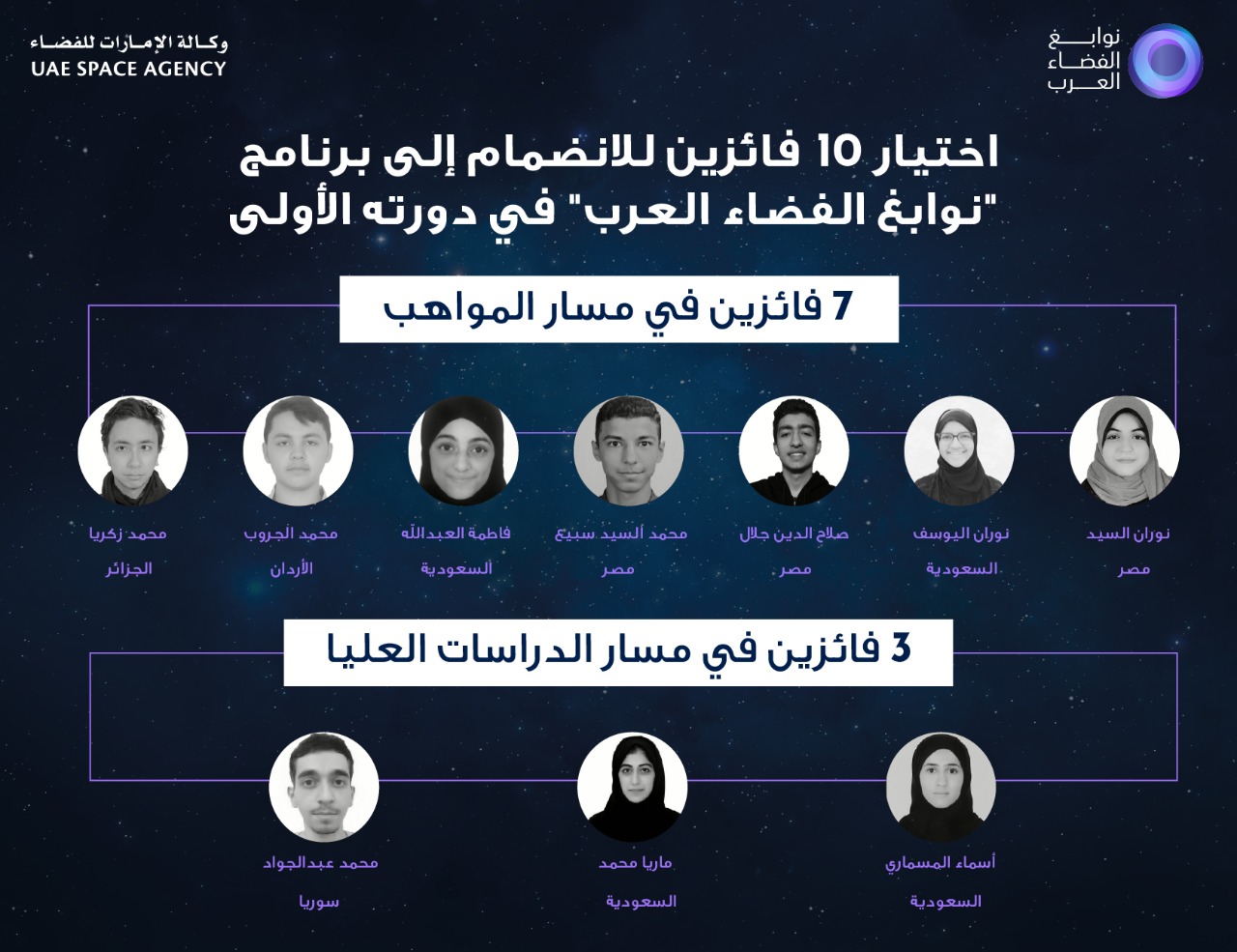 أعلنت وكالة الامارات للفضاء عن اختيار 10 فائزين للانضمام إلى الدورة الأولى من برنامج “نوابغ الفضاء العرب”، البرنامج العلمي التدريبي المكثف الأول من نوعه عربياً.