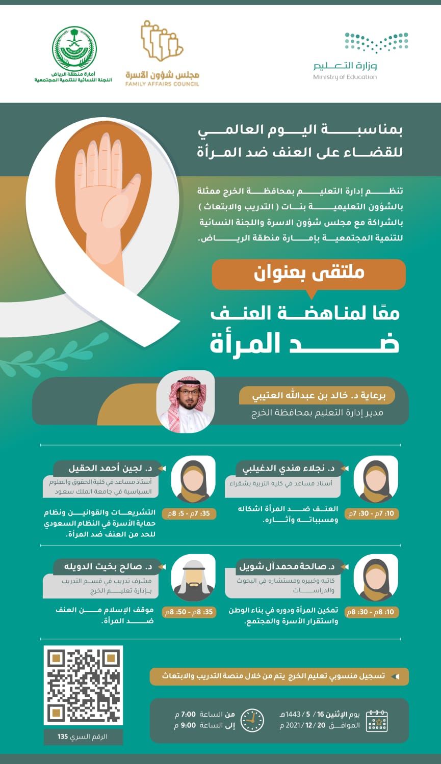 برعاية مدير إدارة التعليم بمحافظة الخرج د.خالد بن عبدالله العتيبي وحضور أكثر من ( 550) حاضرة نظمت إدارة الشؤون التعليمية -بنات -(التدريب والابتعاث )بالشراكة مع مجلس شؤون الأسرة واللجنة النسائية للتنمية المجتمعية بإمارة منطقة الرياض مساء أمس الاثنين الموافق ١٦ /٥ /١٤٤٣هـ ملتقى عن بعد بعنوان ( معاً لمناهضة العنف ضد المرأة) وذلك بمناسبة اليوم العالمي للقضاء عن العنف ضد المرأة.