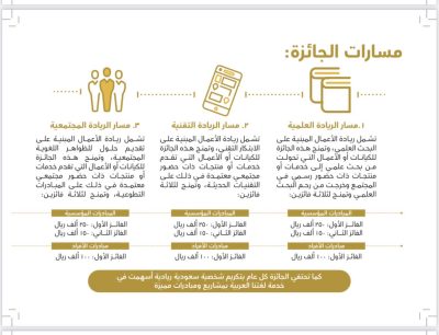 • الريادة التقنية: وتختص بريادة الأعمال المبنية على الابتكار التقني، وتمنح هذه الجائزة للكيانات أو الأعمال التي تقدم خدمات أو منتجات ذات حضور مجتمعي معتمدة في ذلك على التقنيات الحديثة، وفي هذا المسار ثلاث جوائز بقيمة 500 ألف ريال.