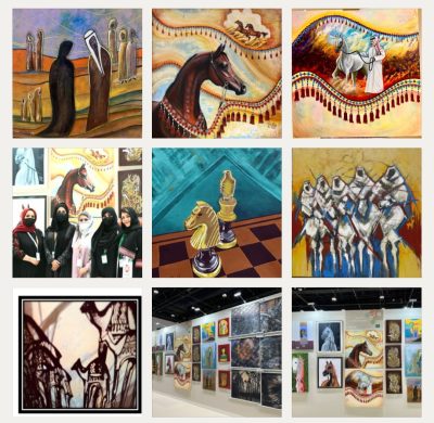 وبينت الفنانة التشكيلية الأستاذة عائشة الحارثي أنها قامت بعرض مجموعة من اللوحات بجناح جماعة الفن الأبيض تعبر عن روح معرض أبو ظبي الدولي للصيد والفروسية، والذي يعني في الأساس بإعلاء قيم التراث والأصالة الذي عبر شعاره “استدامة وتراث بروج متجددة”، إذ تضمنت مفردات الخيول والغزلان والحيوانات المهددة بالانقراض وكيفية حمايتها، فكانت تلك الموضوعات التي تم انتقائها وكيفية التعبير عن هذه الرموز الثقافية والتراثية, وعبرت الحارثي عن تقديرها لمشاركة الفنانات السعوديات في هذا الحدث العالمي، والتي بدورها لابد وان تنعكس على التجارب الفنية للمشاركات.