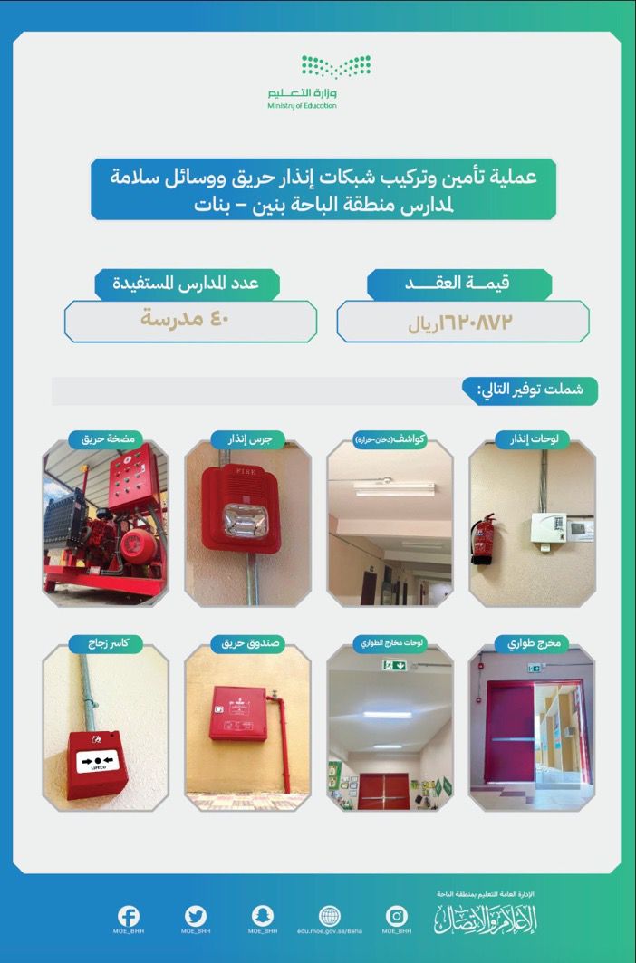 أنهت إدارة الأمن والسلامة المدرسية بالإدارة العامة للتعليم بمنطقة الباحة أعمال تأمين وتركيب شبكات إنذار الحريق ووسائل السلامة الأخرى في 40 مدرسة للبنين والبنات على مستوى المنطقة بتكلفة زادت عن مليون و ستمائة ألف ريال.