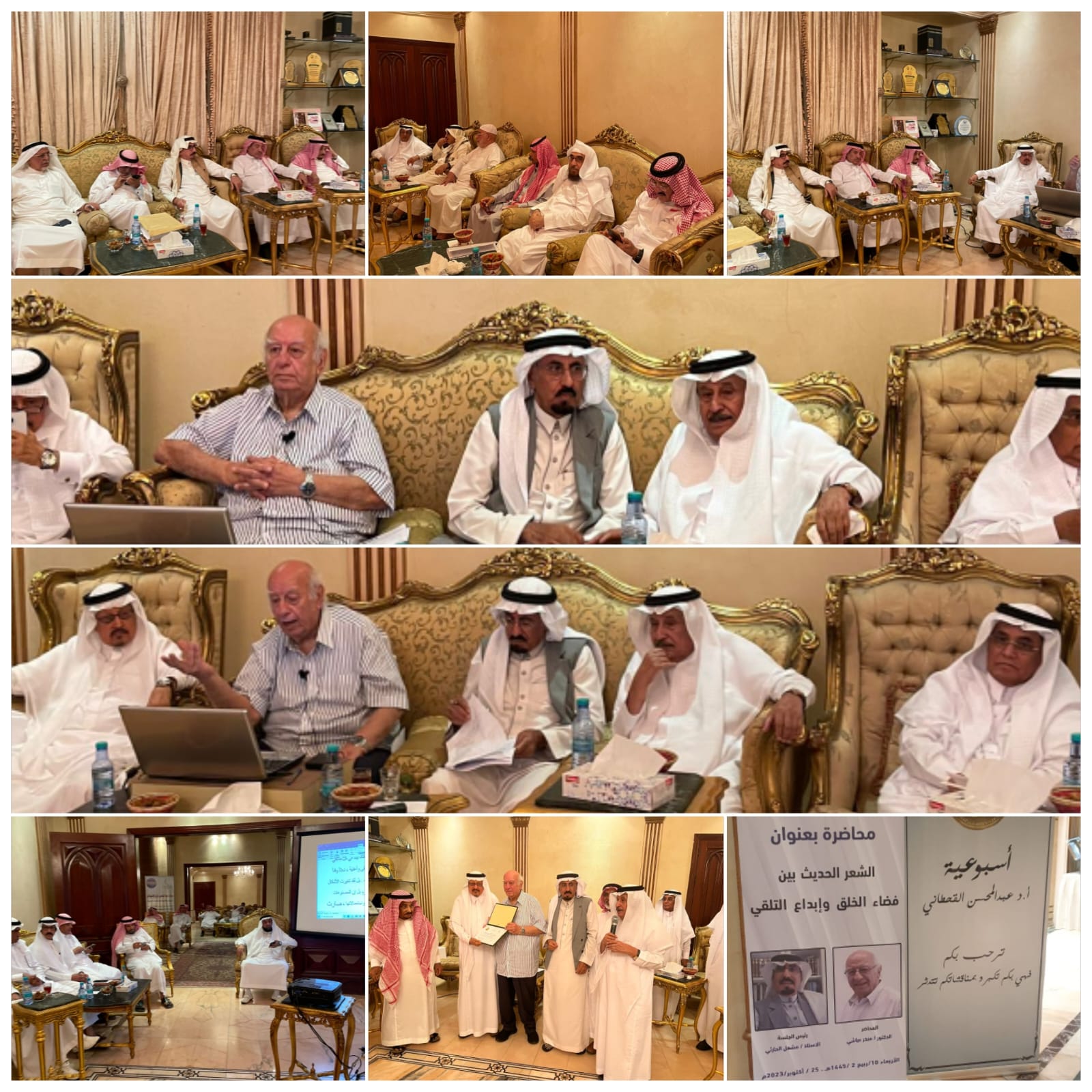 أعلن مستشار أمير منطقة مكة المكرمة ونائب رئيس مجلس الشورى الأسبق معالي الدكتور عبدالله المعطاني تحيات وثناء سمو الأمير خالد الفيصل على الأسبوعية وصاحبها الدكتور عبدالمحسن القحطاني ودورها الفاعل في خدمة الأدب والثقافة، كما أعلن تقديم سموه هدية رمزية لضيف الأسبوعية الدكتور منذرعياشي تقديراً لدوره ايضاً في خدمة الأدب واللغة العربية ووفائه للمملكة العربية السعودية ، جاء ذلك في الكلمة التي القاها معاليه في مستهل المحاضرة التي القاها ضيف الأسبوعية الدكتور منذر عياشي مساء البارحة الأربعاء ضمن نشاط الأسبوعية في موسمها لهذا العام 1445هـ وتحت عنوان (الشعرالحديث بين فضاء الخلق وإبداع التلقي) وأدارها المستشار الإعلامي الاسبق بجامعة جدة الأستاذ مشعل الحارثي وبحضورنخبة مميزة من الأدباء والمثقفين والإعلاميين ورواد الأسبوعية.