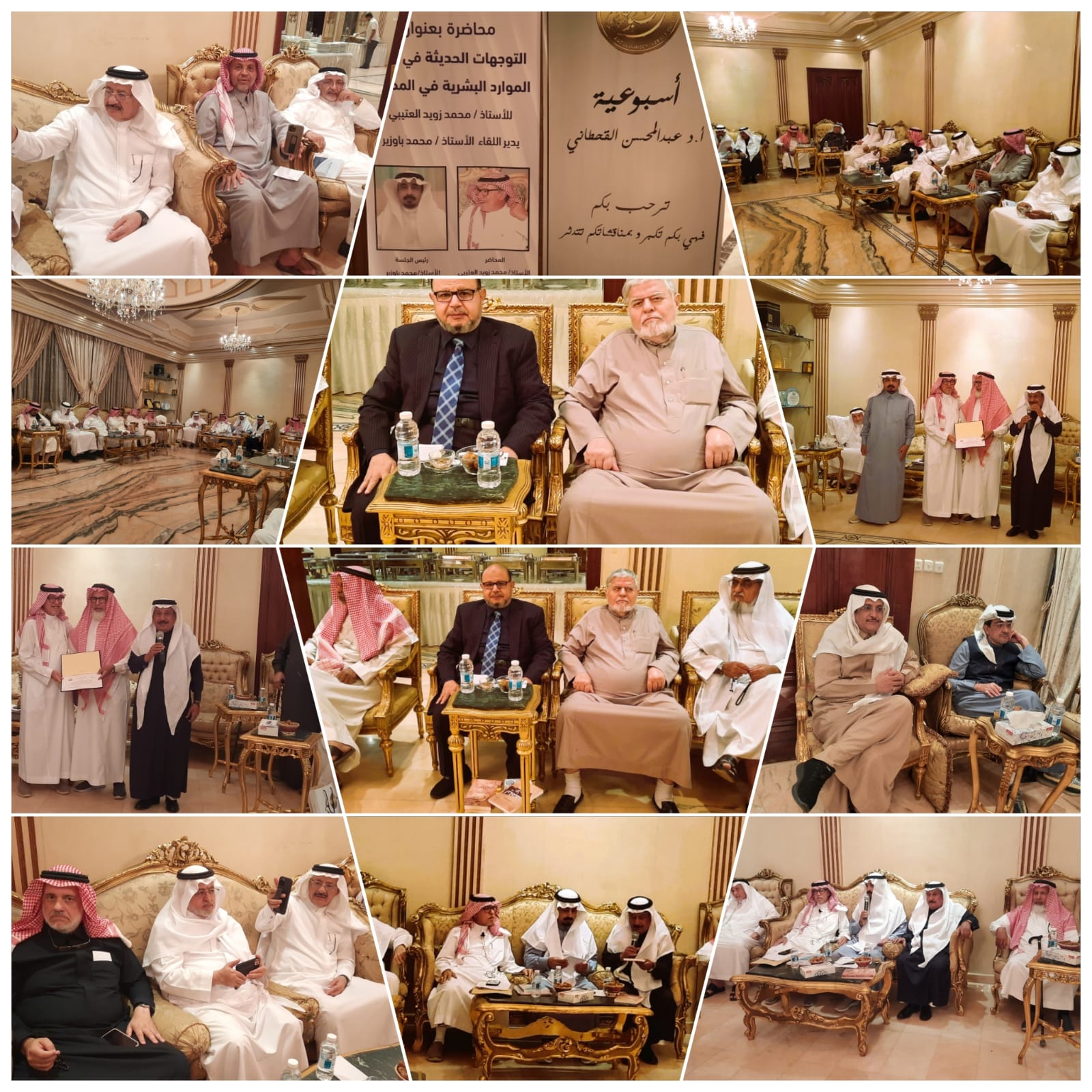 استضافت أسبوعية الدكتور عبد المحسن القحطاني، المستشار والخبير الإداري الأستاذ “محمد زويد العتيبي”؛ لإلقاء محاضرة بعنوان “التوجهات الحديثة في إدارة الموارد البشرية في المملكة”، وقد أدار الأمسية الإعلامي أ. محمد باوزير؛ الذي بدأها بالتعريف بالضيف حيث أشار إلى أنه مستشار وخبير إداري بالموارد البشرية؛ عضو هيئة التدريب بمعهد الادارة العامة سابقا، خبرة بالعمل الإداري والتدريبي لمدة أربعين 40 عامًا؛ حيث تخرج من جامعة الملك عبد العزيز في تخصص الإدارة، ثم حصل على الماجستير في الإدارة العامة من جامعة بنسلفانيا بالولايات المتحدة، وتم تعيينه في معهد الإدارة العامة عقب تخرجه، وقد شغل في المعهد عددا من المناصب القيادية منها مدير إدارة التدريب ومدير الشئون القانونية.