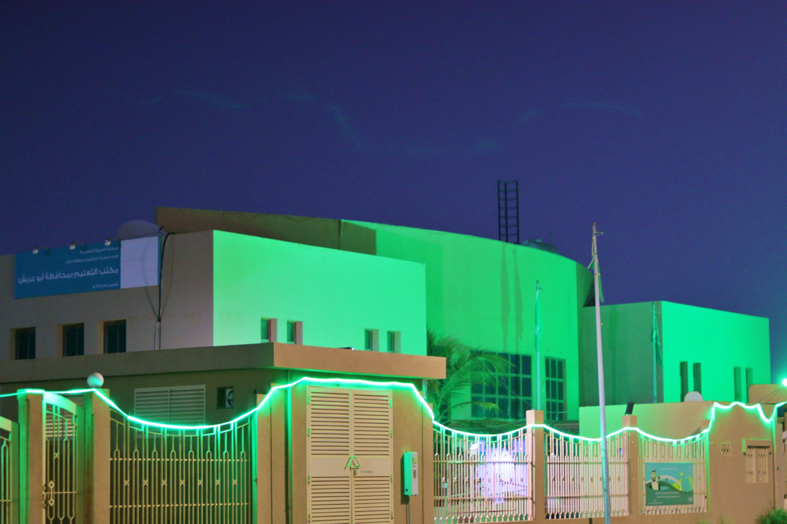 كما ازدانت المباني باللون الأخضر الذي يرمز إلى السلام والاستقرار والتطور، والمعبر عن حب الوطن والولاء لقيادته، عبر عدد من الإضاءات الديكورية والليزرية الخضراء، وعلت ورفرفت راية العز خفاقة بفخر فوق أسوارها وداخل ساحاتها، مجسدة العمق التاريخي لهذا الوطن العظيم، ورامزة لهويتنا الإسلامية التي نفتخر بها، وما يحظى به المواطن السعودي من عزة ومكانة وكرامة، فيما عكست صور القيادة الرشيدة وملوك المملكة العربية السعودية الذين ساهموا في بناء هذا الوطن وصنع تاريخه، والتي ازدانت بها مباني تعليم جازان روح الوحدة والانتماء الوطني الذي يجمع الشعب وقيادته الحكيمة.