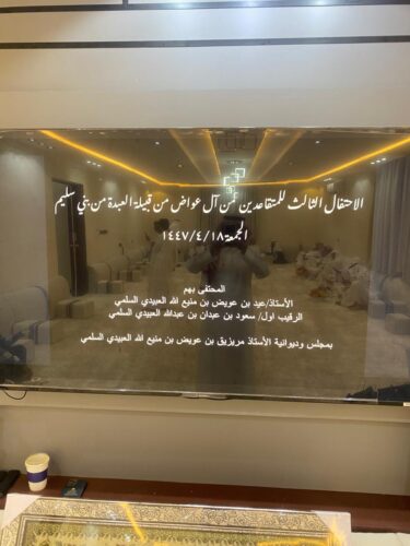 حيث أقيم الاحتفال في مجلس وديوانية الأستاذ مريزيق بن عويض بن منيع الله العبيدي السلمي في محافظة الكامل – حرة العياب –