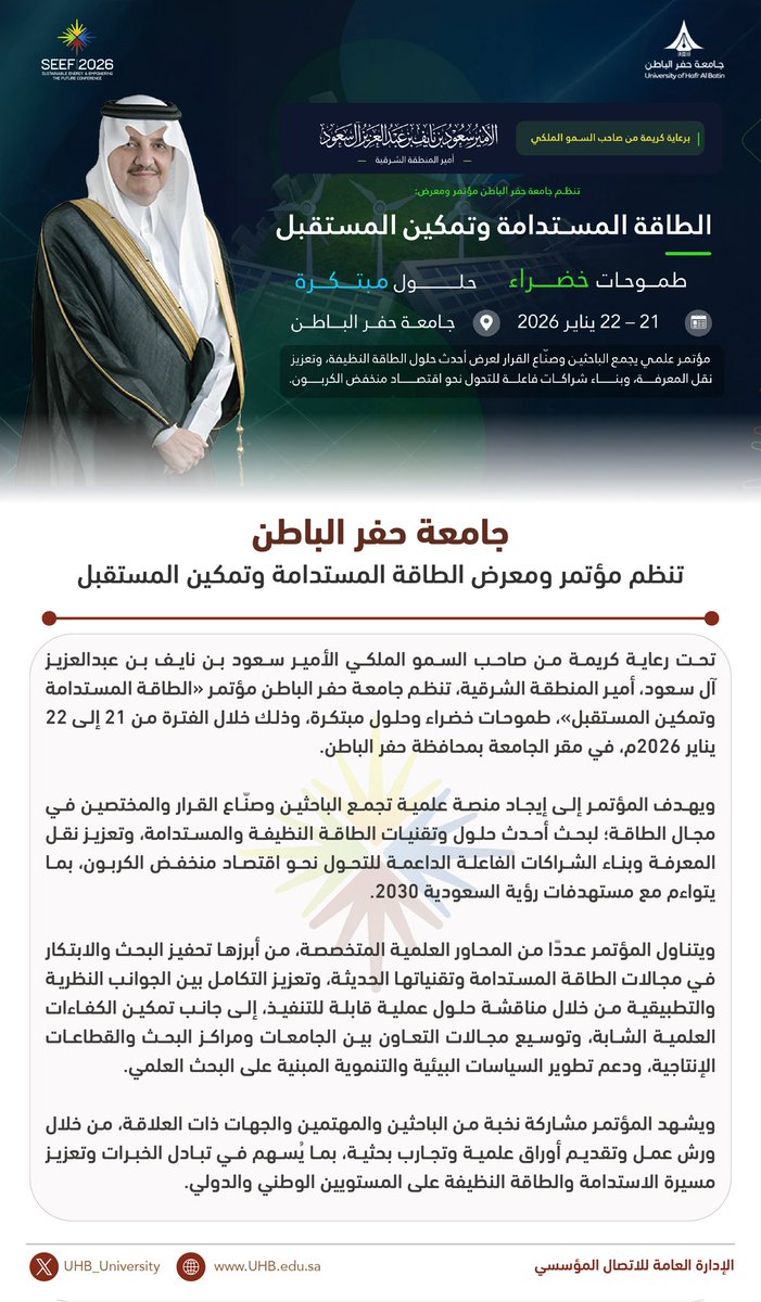 تحت رعاية كريمة من صاحب السمو الملكي الأمير سعود بن نايف بن عبد العزيز آل سعود، أمير المنطقة الشرقية، تنظم جامعة حفر الباطن مؤتمر «الطاقة المستدامة وتمكين المستقبل»، طموحات خضراء وحلول مبتكرة، وذلك خلال الفترة من 21 إلى 22 يناير 2026م، في مقر الجامعة بمحافظة حفر الباطن.