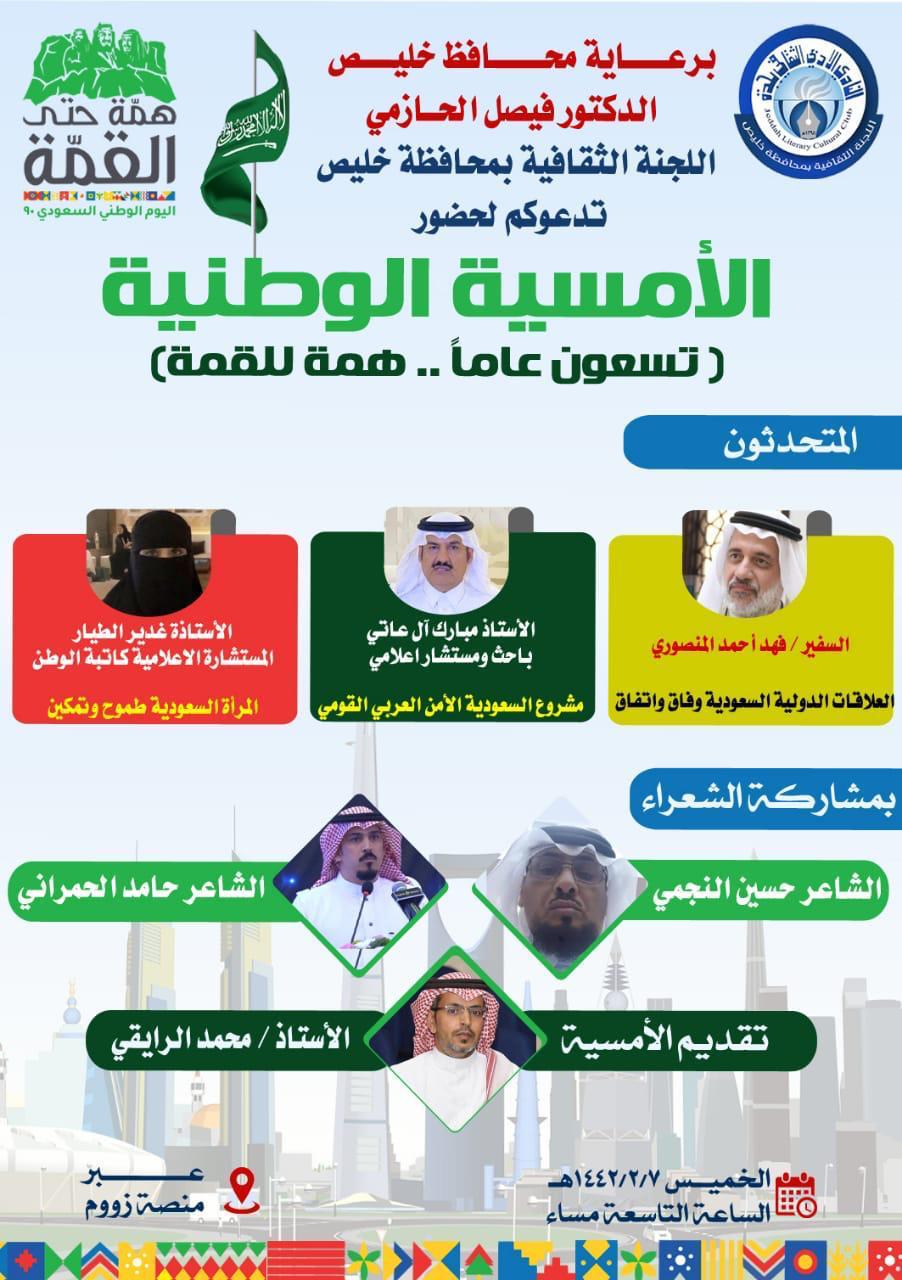 تنظم اللجنة الثقافية بمحافظة خليص وبرعاية كريمة من سعادة المحافظ الدكتور فيصل بن غازي الحازمي أمسية وطنية بمناسبة اليوم الوطني للمملكة العربية السعودية [ تسعون عامًا … همة للقمة ] بمشاركة مجموعة من الشخصيات البارزة في المجتمع وفق المحاور التالية :-